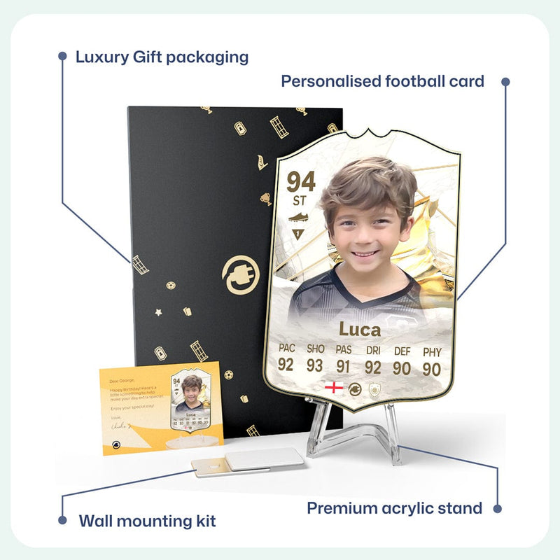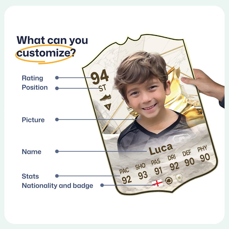 When it comes to personalising your card, the basic steps are to upload a photo and add a name to your card. Then you’ll add details like your player’s position and skill ratings out of 99 for each football skill shown on the card. Our online card builder makes this really easy. And if you aren’t a football card expert, don’t worry!