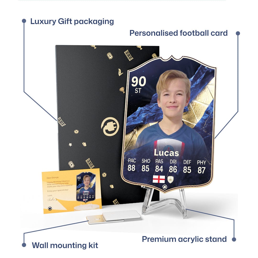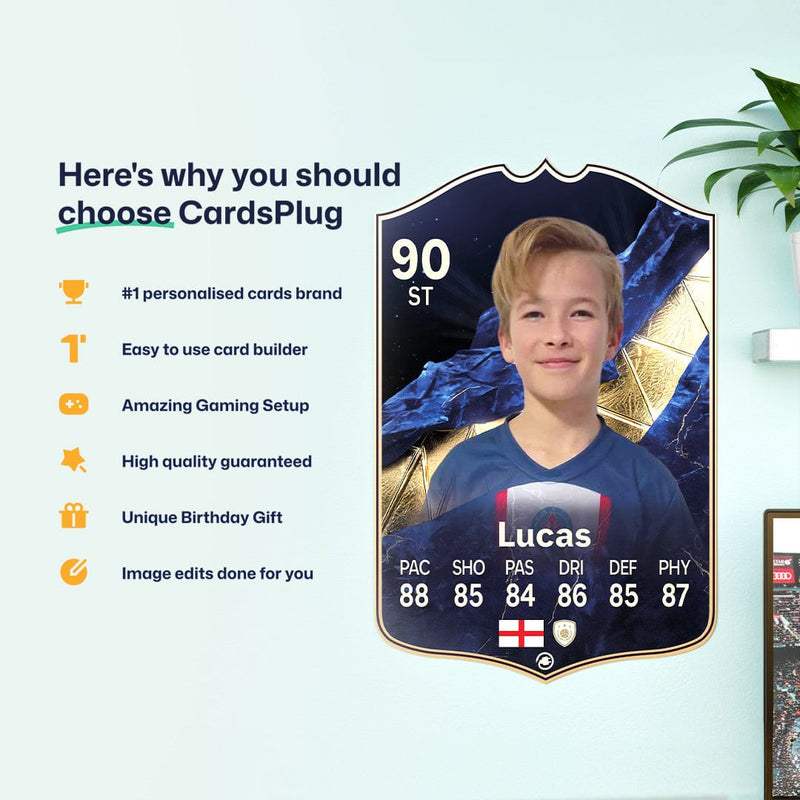 CardsPlug is home to the world’s favourite personalised football cards. Our easy football card builder lets you make a real life football card with your own name, photo, and skill ratings. With 100+ designs to choose from and some inspired by EA SPORTS FC 26 cards seen in EA FC 26, EA FC 25 and FC 24 as well as FIFA cards seen in games like FIFA 23 and FIFA 22.