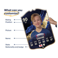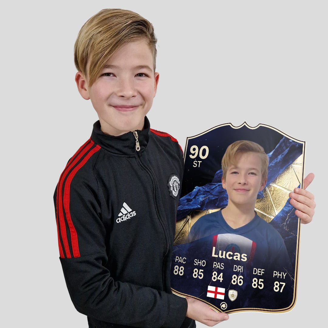 When it comes to personalising your card, the basic steps are to upload a photo and add a name to your card. Then you’ll add details like your player’s position and skill ratings out of 99 for each football skill shown on the card. Our online card builder makes this really easy. And if you aren’t a football card expert, don’t worry!