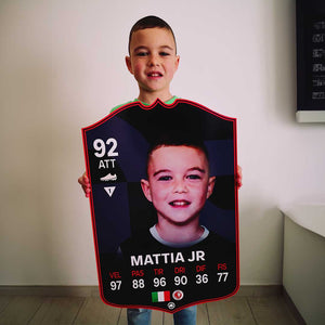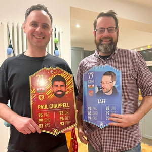 Our football card builder lets you choose between two different card materials. Our Standard cards are made of a ultra-strong variety of Foamex (not cardboard or foam!). This material has a lovely gloss finish and is also super durable. Our world-exclusive Metal football cards have a matte finish and are slightly heavier. Both look amazing and will last forever.