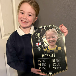 When it comes to personalising your card, the basic steps are to upload a photo and add a name to your card. Then you’ll add details like your player’s position and skill ratings out of 99 for each football skill shown on the card. Our online card builder makes this really easy. And if you aren’t a football card expert, don’t worry!