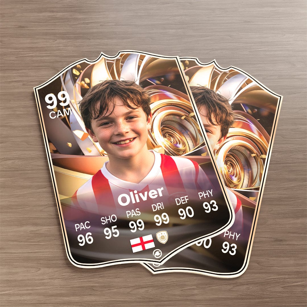 CardsPlug is home to the world’s favourite personalised football cards. Our easy football card builder lets you make a real life football card with your own name, photo, and skill ratings. With 100+ designs to choose from and some inspired by EA SPORTS FC 26 cards seen in EA FC 26, EA FC 25 and FC 24 as well as FIFA cards seen in games like FIFA 23 and FIFA 22.